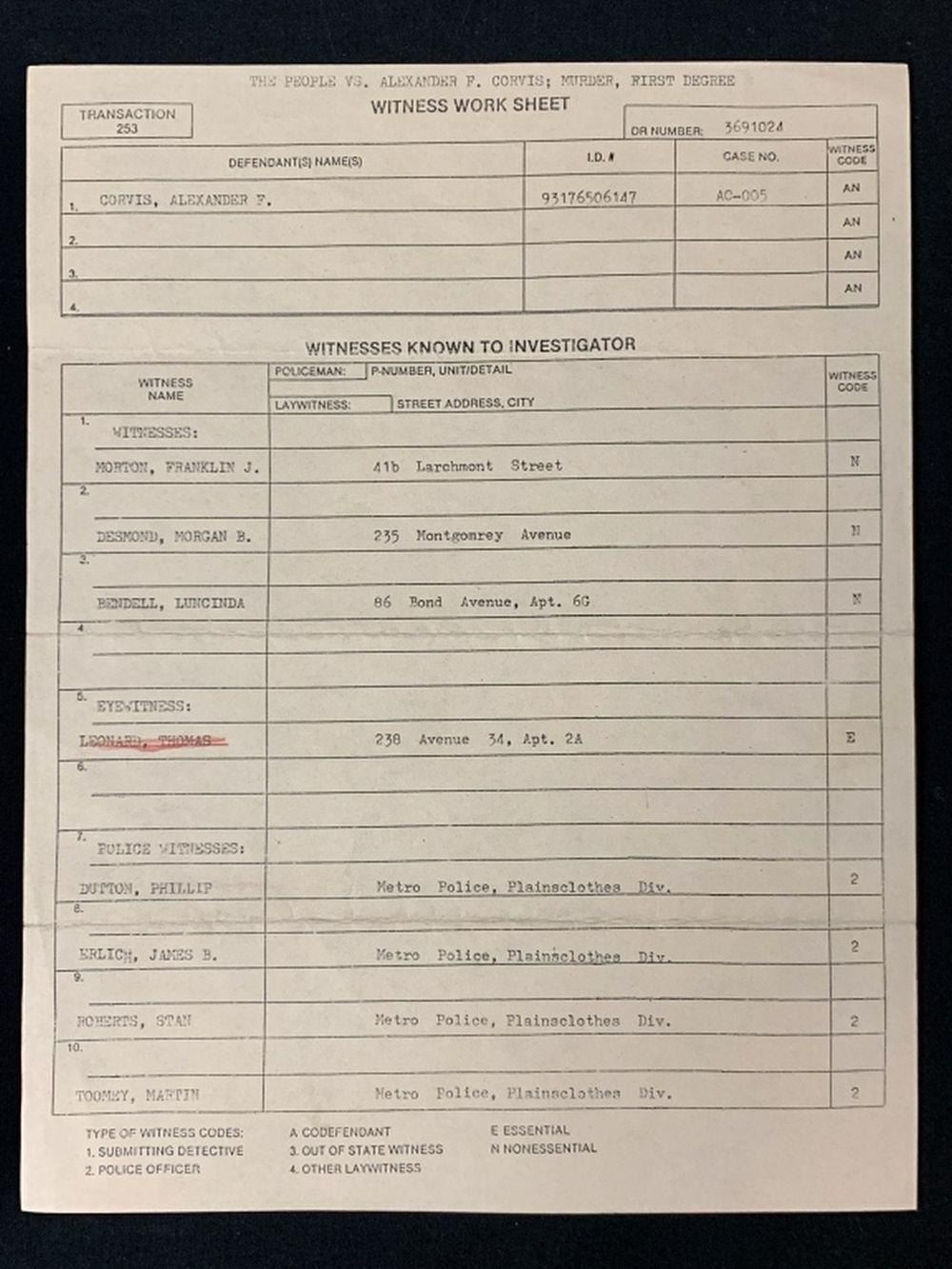 Original witness hit list used by "Alex Corvis", played by Eric Mabius in the supernatural superhero film "The Crow: Salvation" (2000). The third entry in 'The Crow' series follows Alex Corvis, who was framed for the murder of his girlfriend and is executed. he is then brought back from the dead by a crow when the legend says 'Love is stronger than death'. He returns to discover that a corrupt police force is behind her murder and for him to go after the killers, he must find out the mystery behind everything that happened.