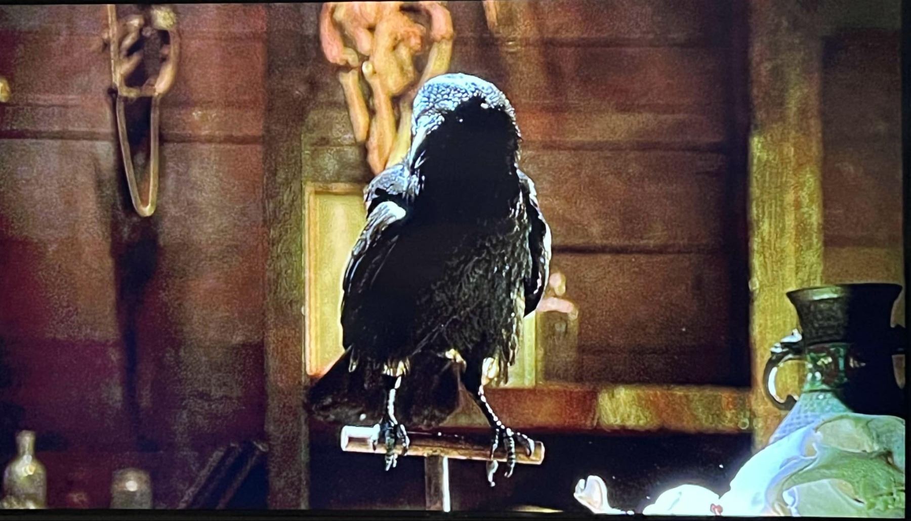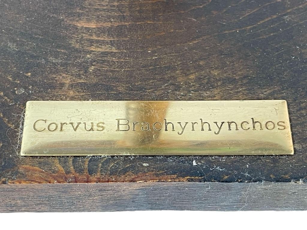 The perch has a plaque on the front reading "Corvus Brachyrhynchos".