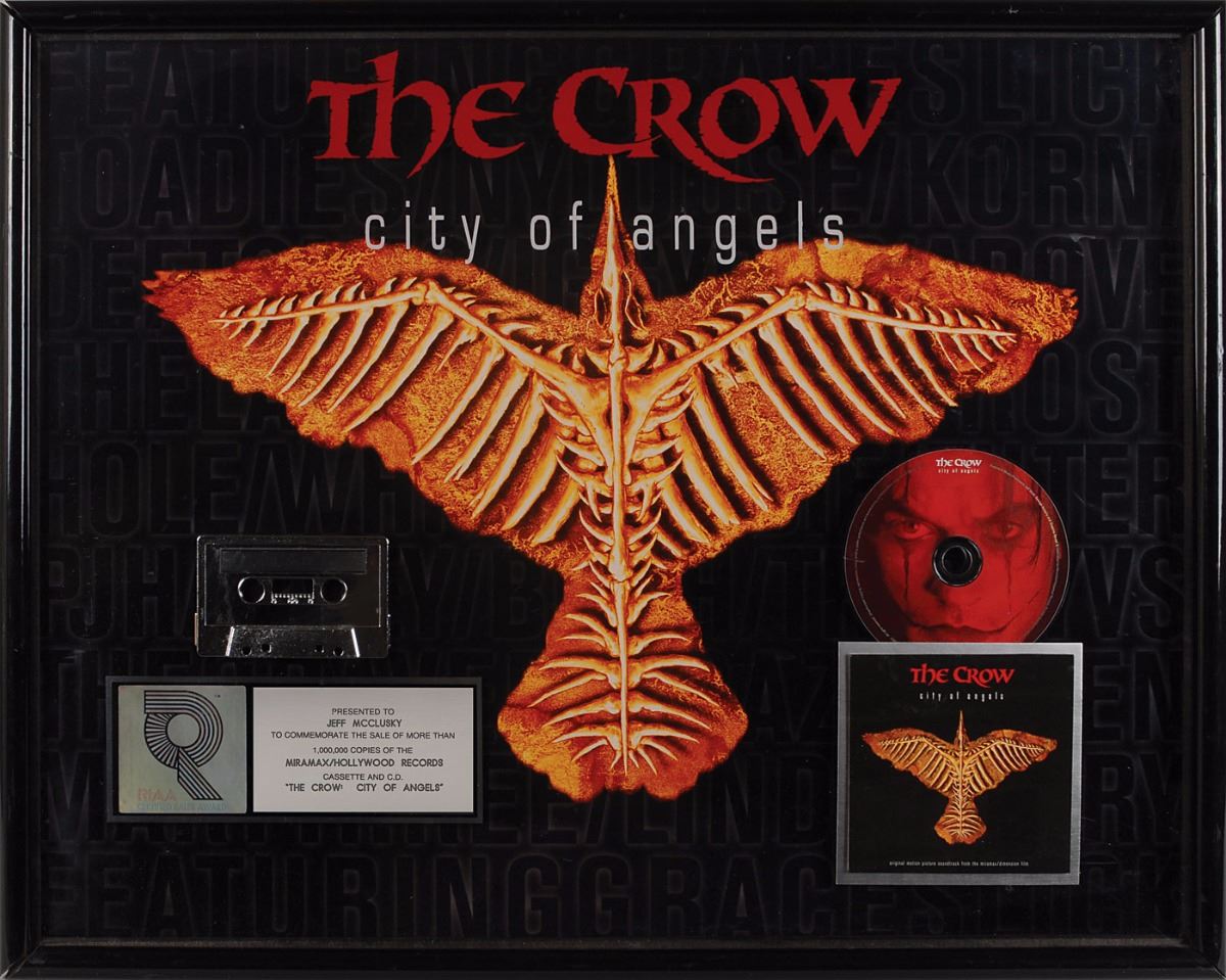 Official ‘R’ hologram-style RIAA platinum sales award presented “to commemorate the sale of more than 1,000,000 copies of the Miramax/Hollywood Records cassette and C.D. ‘The Crow: City of Angels.” Framed with its plate, CD, cassette, and an image of the album cover against a stylized background to an overall size of 25 x 20. Award retains its original backing with an Ill-Eagle Enterprises label. In fine condition.
