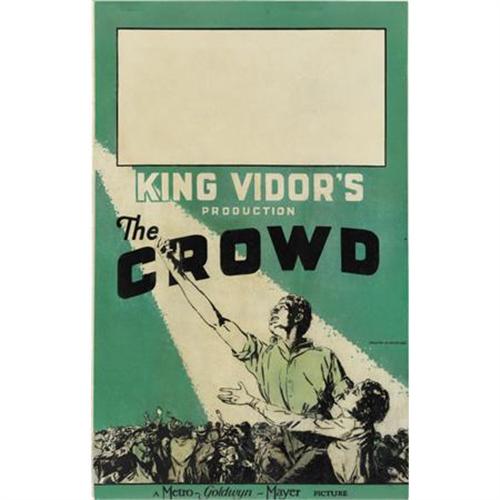 <B>The Crowd (MGM, 1928).</B></I> Window Card (14" X 22"). Director King Vidor had to fight the studio heads to get "The Crowd" made and the film went on to become an important picture about the plight of the common man. It had a huge emotional impact with audiences and the film was nominated for Best Picture as Vidor was nominated for Best Director. The film also starred Eleanor Boardman, King Vidor's actual wife. This window card has been re-backed to correct a crack that ran vertically through the title and into the side of James Murray's head. There was further wear around the edges and some of the green background and the crowd at the bottom has had work. Very Good/Fine on Cardstock. <BR><BR><b>Shipping:</b> Flat Material, Large (<a target="_blank" href="http://www.heritageauctions.com/common/shipping.php">view shipping information</a>)