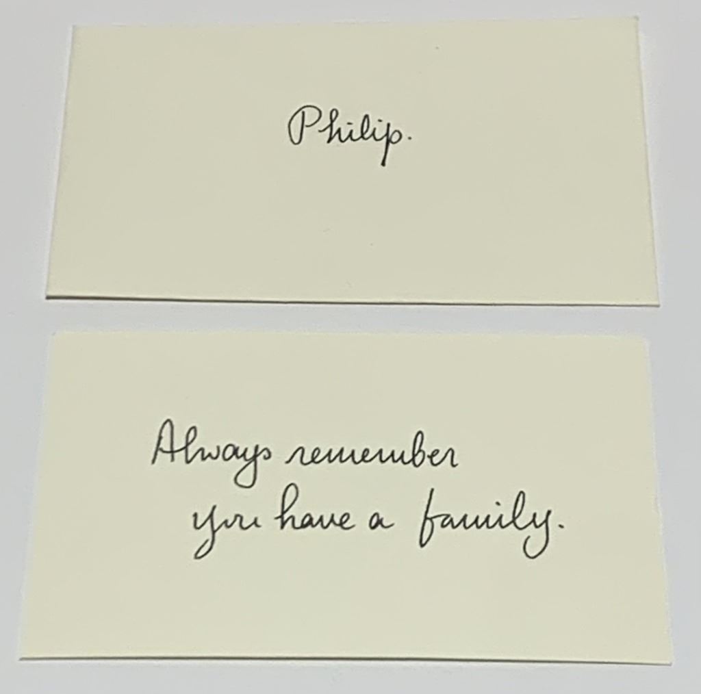 Original note in envelope sent from the Queen to Philip in the historical drama television series 'The Crown' (2016-), about the reign of Queen Elizabeth II, created and principally written by Peter Morgan, and produced by Left Bank Pictures and Sony Pictures Television for Netflix.