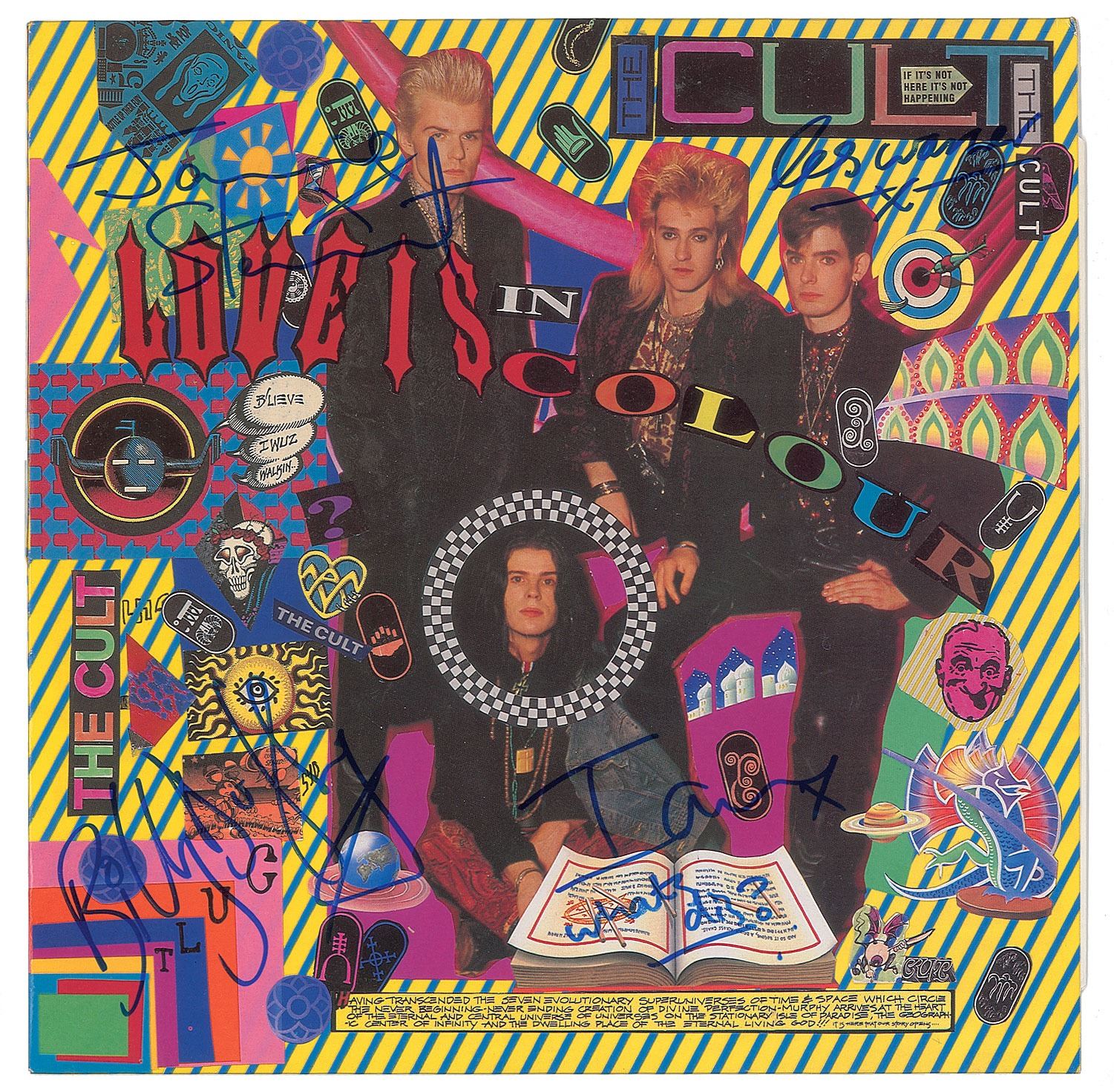 Rare Love Is In Colour album (marked "Radio Station Use Only" on the spine) signed on the front cover in blue felt tip by Ian Astbury, Billy Duffy, Jamie Stewart, and Les Warner. In fine condition. The record is included.
