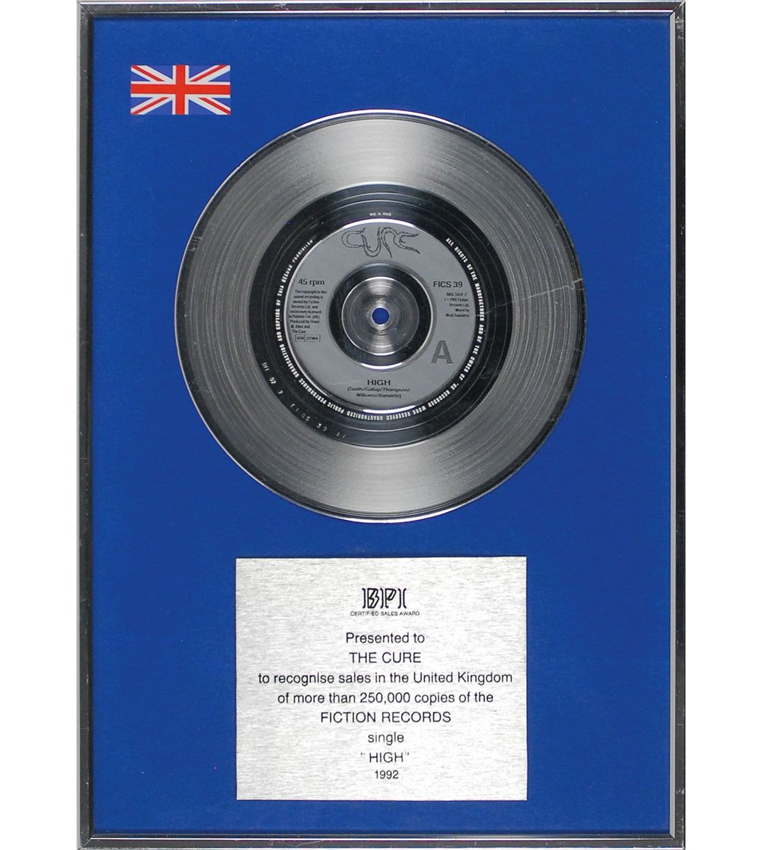 Official BPI record sales award presented to “The Cure to recognise sales in the United Kingdom of more than 250,000 copies of the Fiction Records single ‘High’ 1992.” Disc is framed with its plaque to an overall size of 10.25 x 14.25. In fine condition.