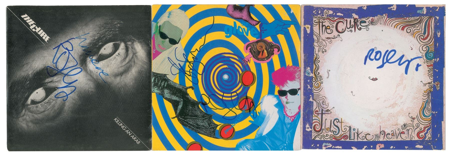 Three 45 RPM single records: 'Like an Animal / Mouth to Mouth' by The Glove, signed on the front cover in blue felt tip by Robert Smith and Steven Severin; 'Killing an Arab / 10:15 Saturday Night' by The Cure, signed on the front cover in blue felt tip by Smith and Lol Tolhurst; and 'Just like Heaven / Snow in Summer' by The Cure, signed on the front cover in blue felt tip by Smith. In overall fine condition. The records are included.