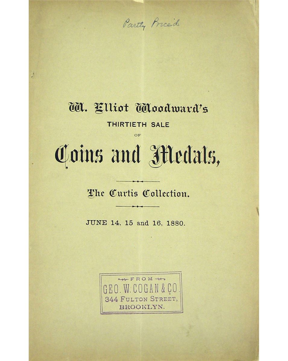 Woodward, W. Elliot. CATALOGUE OF COINS, MEDALS AND TOKENS... COMPRISING THE ENTIRE COLLECTION OF EARLY AMERICAN AND COLONIAL COINS OF W.T. CURTIS, ESQ., OF PORTLAND. New York, June 14-16, 1880. 8vo, original printed wraps. 70 pages; 2005 lots. Mostly hand-priced in pencil. Folded for mailing; very good or better. Woodward's 30th sale. The sale includes 309 lots of Connecticut coppers. Adams B. Ex Fanning Sale III, lot 618.