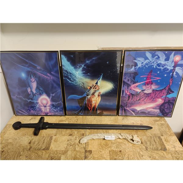 Ornate Dragon Knife, Heavy Rubber Practice Sword & 3 Framed Fantasy Artworks