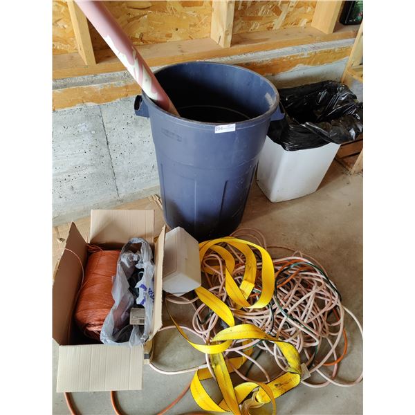 Garbage Bins, Fan, Car Batt, Heavy Duty Strap, Extension Cords, Large Spool of Plastic Twine & More