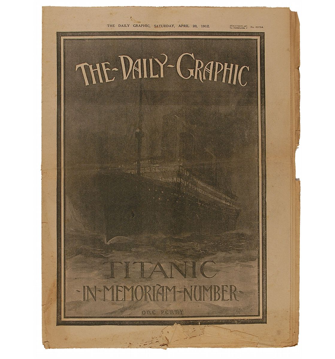 Original and complete April 20, 1912, issue of The Daily Graphic, entirely devoted as a Titanic memorial, 12.5 x 16.5, 20 pages. Front cover bears a large image of the liner, with the inside full of photos of victims and survivors, stories of the disaster, and images of the relief efforts. In good condition, with horizontal tear to final few pages, central horizontal fold, scattered edge wear and paper loss, and toning and damp staining.