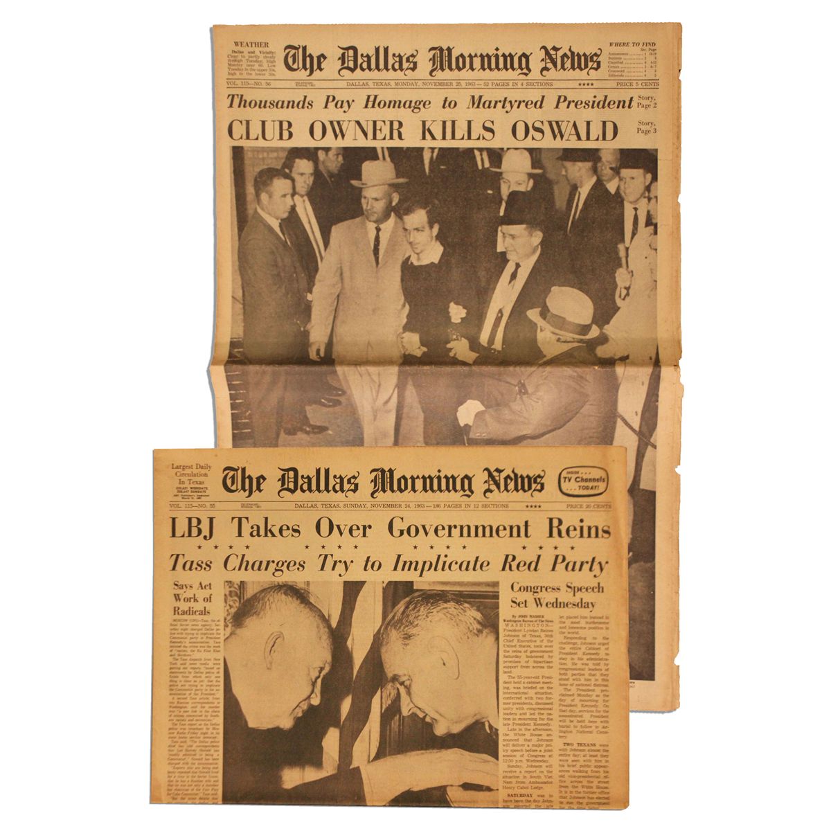 Two Dallas newspapers immediately following the assassination of JFK. 25 November 1963 edition of the ''Dallas Morning News'' reads: ''CLUB OWNER KILLS OSWALD'' with a full page photo of gunman Jack Ruby pointing the gun at Oswald. 24 November edition bears headline ''LBJ Takes Over Government Reins''. The 20pp. and 14pp. papers are toned throughout with some minor chipping. Overall very good condition.