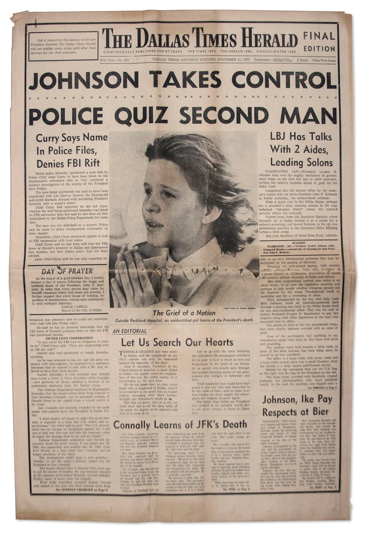 23 November 1963 issue of ''The Dallas Times Herald'', covering the funeral of John F. Kennedy. Headline reads; ''Johnson Takes Control / Police Quiz Second Man'', and features touching picture of a young girl crying outside of the hospital where Kennedy died. Measures 15.75'' x 12.5''. Toning. Very good.