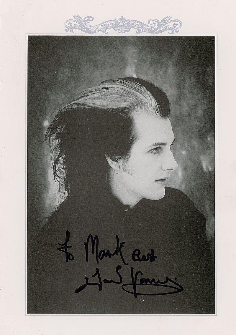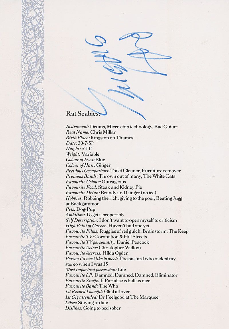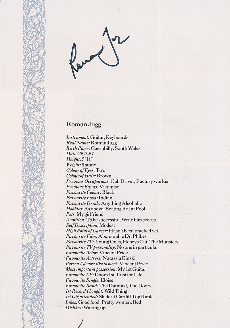 The Damned’s 1986 tour program, 8.25 x 11.75, signed inside in ink and felt tip by all four members, each signing on their individual photos. Signers are: Dave Vanian (ins), Rat Scabies, Bryn Merrick, and Roman Jugg. In fine condition. Accompanied by a full letter of authenticity from Roger Epperson/REAL.
