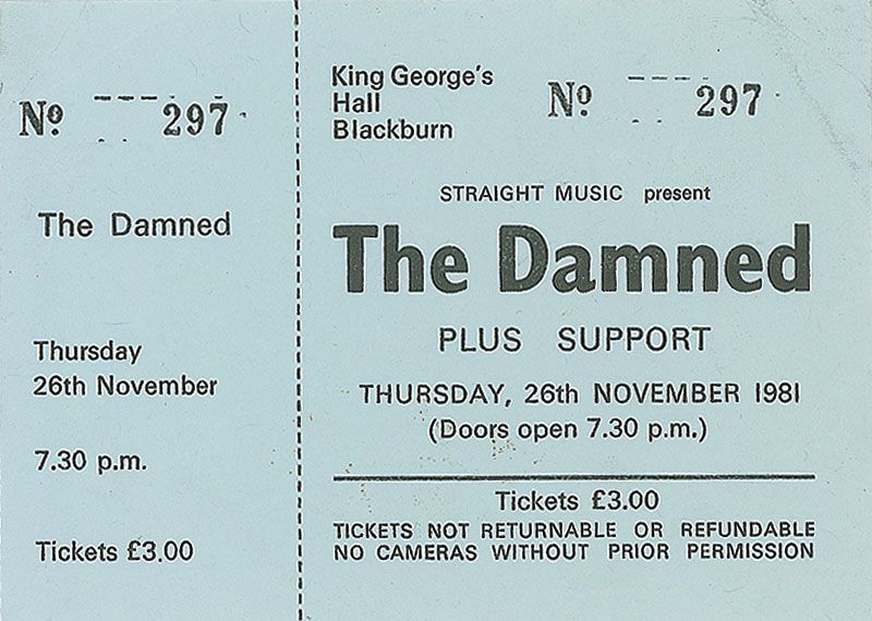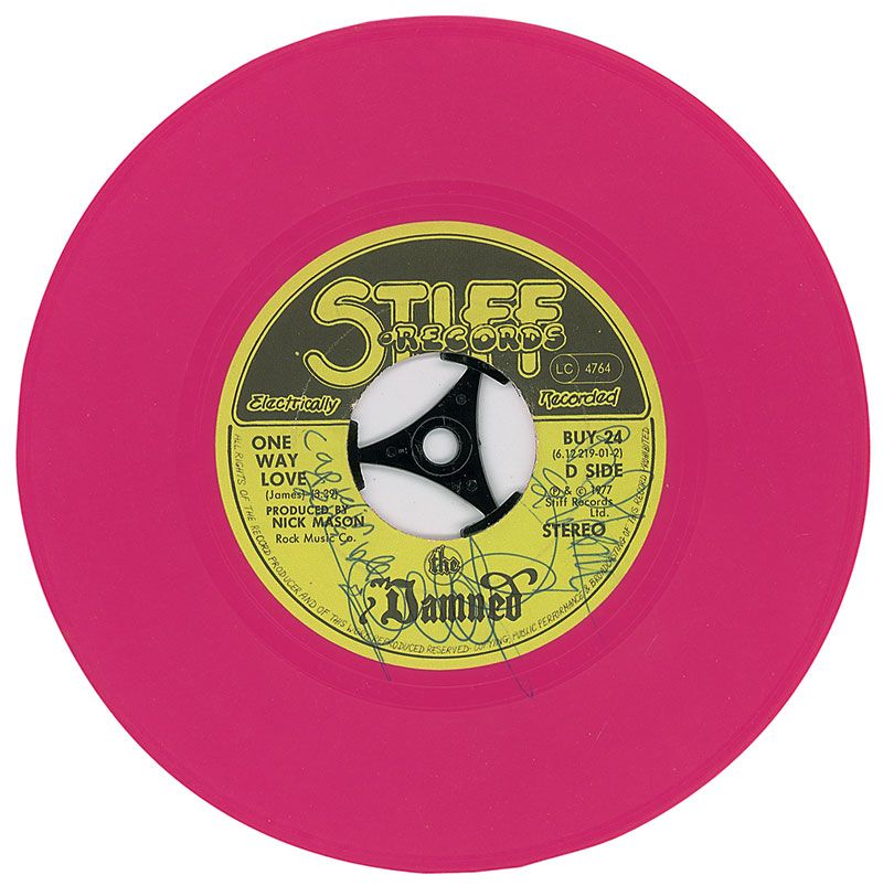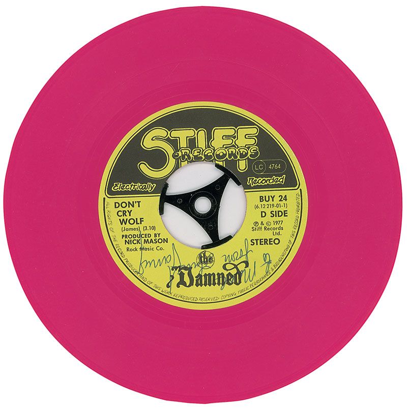 Pink vinyl 45 rpm record for ‘Don’t Cry Wolf,’ signed on either side of the label by David Vanian, Rat Scabies, Captain Sensible, and Algy Ward. In fine condition. Accompanied by a ticket from a performance at King George’s Hall in Blackburn. Also accompanied by a full letter of authenticity from Roger Epperson/REAL.
