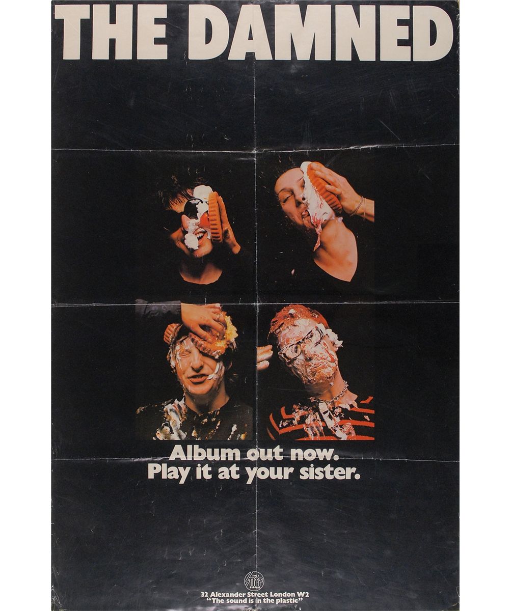Original color 1977 Stiff Records promotional poster, 20 x 30, for band’s debut LP Damned Damned Damned. In very good condition, with intersecting folds, tape remnants to edges and corner tips, and some scattered creases.