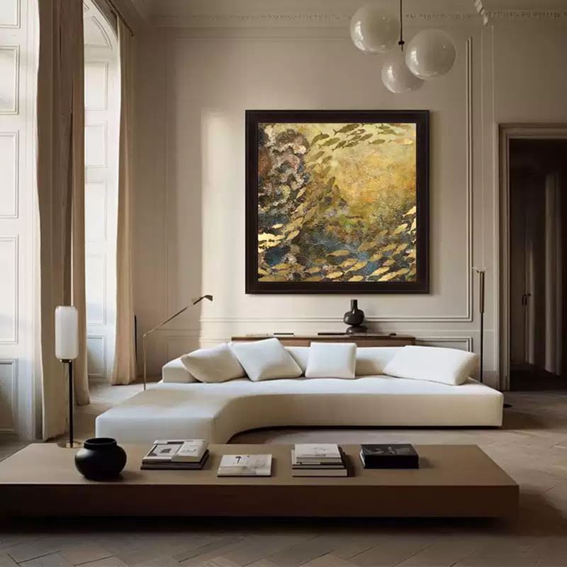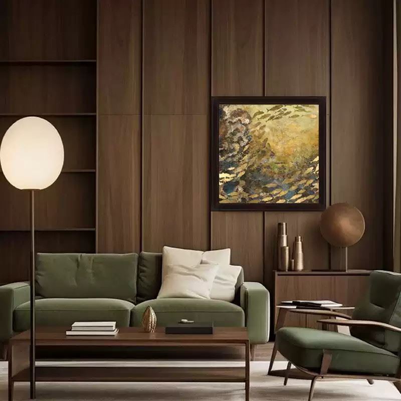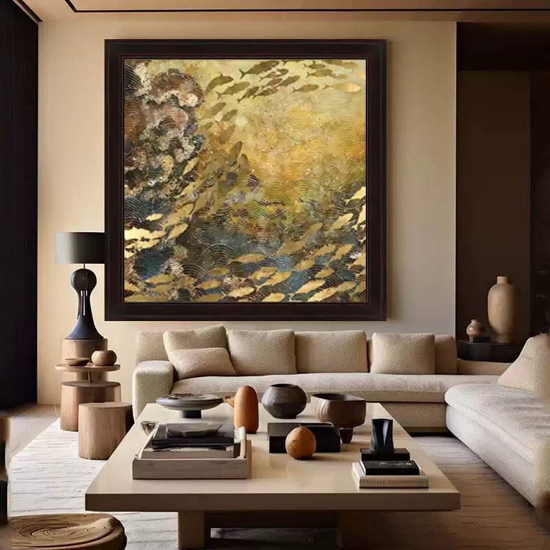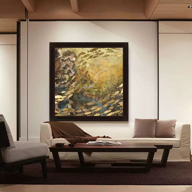 This artwork uses soft tones and delicate lines to depict a school of fish swimming through water. The flowing lines and water wave patterns intertwine, showcasing the beauty and dynamism of nature. Dimensions: 28 x 28 inches.