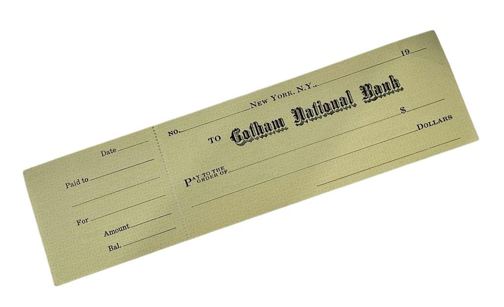 Original Gotham national bank check made for the production of 'The Dark Knight' (2008), the superhero movie where, when the menace known as the Joker emerges from his mysterious past, he wreaks havoc and chaos on the people of Gotham.