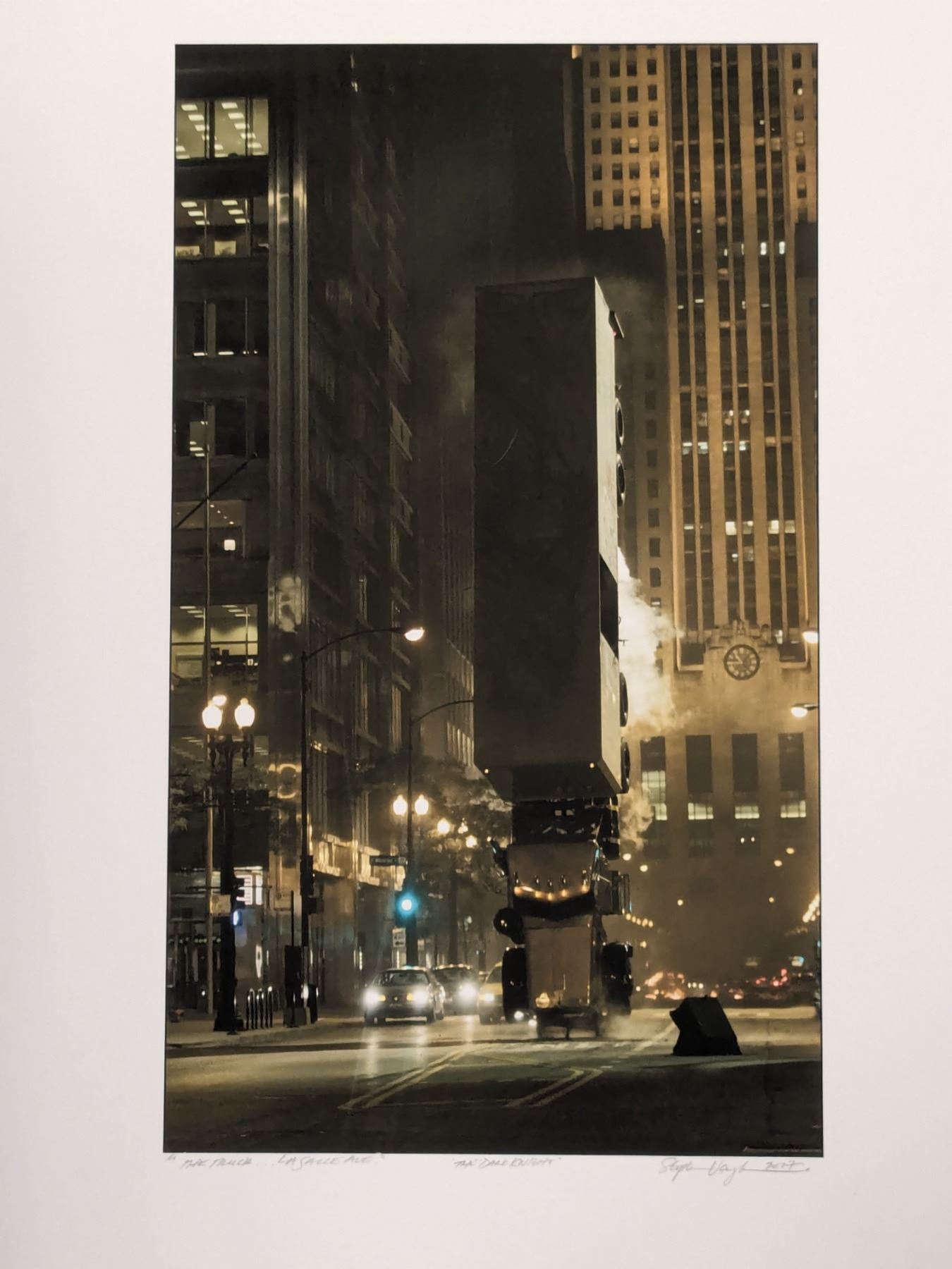 The image depicts the tractor-trailer truck that was driven by the Joker, actor Heath Ledger vertically in the air as a result of Batman tying it up with this Bat Pod. The scene takes place in the middle of a Gotham City street at night. Stephen Vaughan’s signature is at the bottom righthand corner of the image and “the truck” is featured in the bottom left hand corner of the image. This piece measures 22" x 17". The image remains in great condition and is accompanied by a Certificate of Authenticity from Studio Auctions.