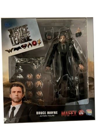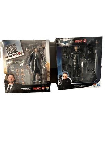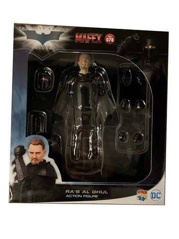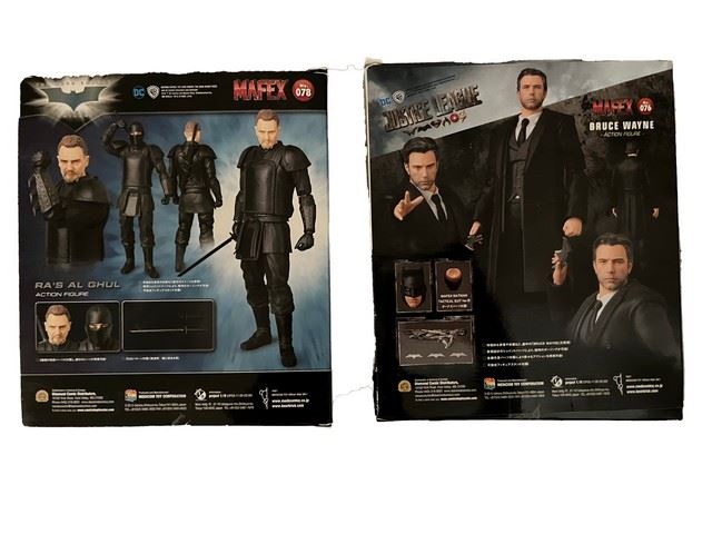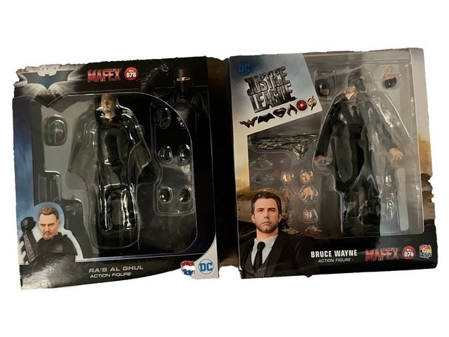 Lot of two DC action figures from "The Dark Knight" featuring Ra's Al Ghul (Medcom Toy Corp) No. 078 (new in the box), and "The Justice League" featuring Bruce Wayne (Medicom Toy Corp). Mafex No. 076. Brand new inside the box. (both (9"x7"). From Constantine Film's production office archives.