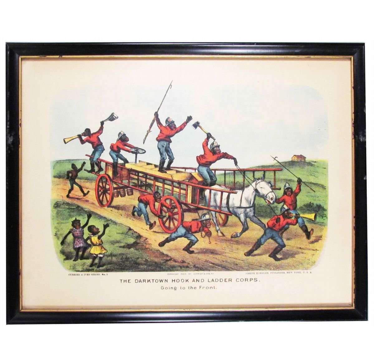 The Darktown Hook and Ladder Corps Print. Entitled, "Going to the Front". Currier & Ives Series No. 7. Copyright 1884. Joseph Koehler Publisher, NY, USA. 16 1/2 X 12 1/2 inches.