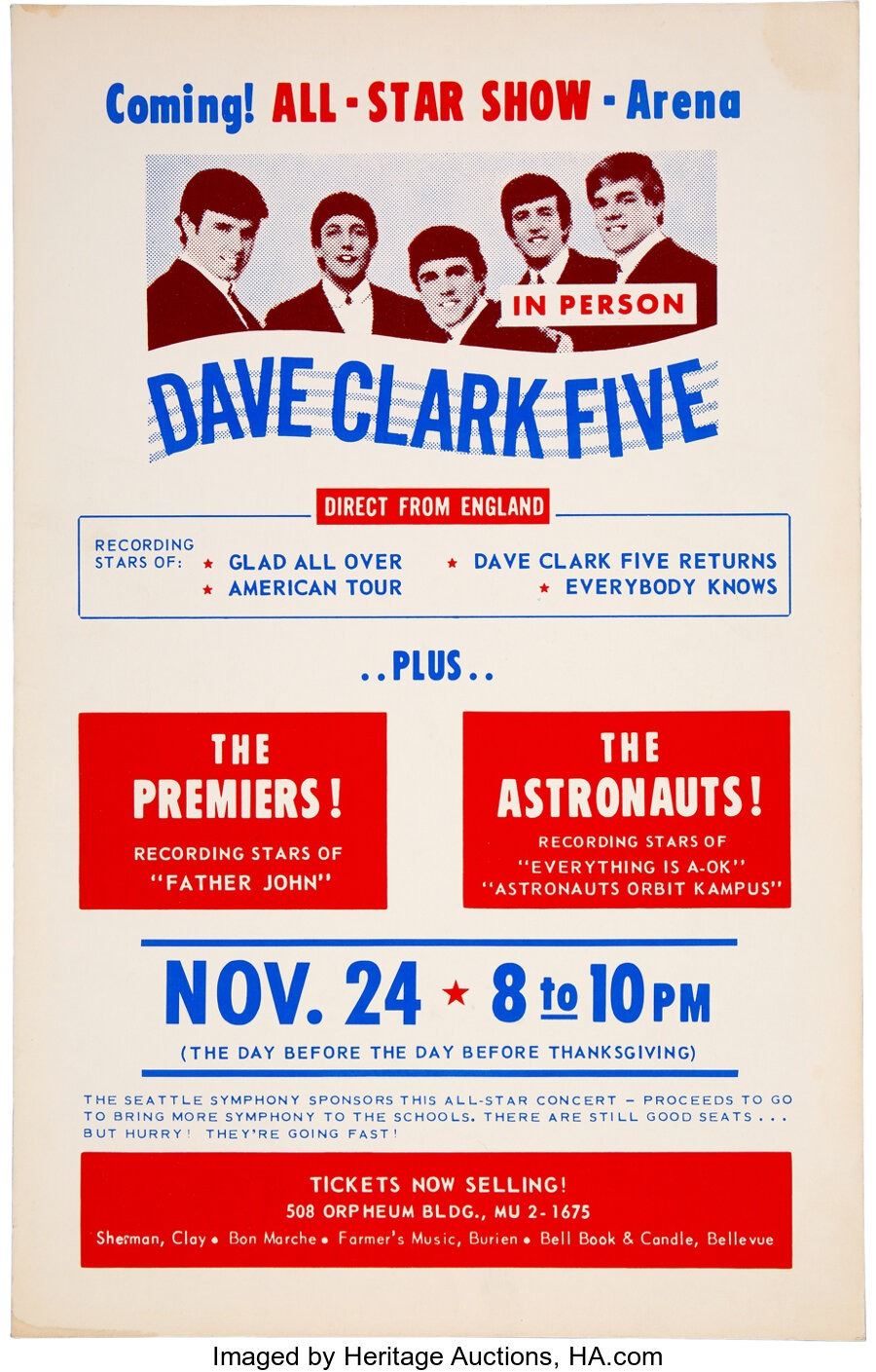The Dave Clark Five 1964 Seattle, WA British Invasion Concert Poster.An original cardboard window card advertising England's Dave Clark Five appearing in Seattle, Washington November 24, 1964 – or "the day before the day before Thanksgiving," as the poster enjoyed putting it. The two opening acts were the California Latin-rock band The Premiers, who had a Top 20 hit with "Farmer John," and Colorado-based surf-rock quintet The Astronauts. Measures 14" x 22" and grades to Very Good Plus condition. COA from Heritage Auctions.