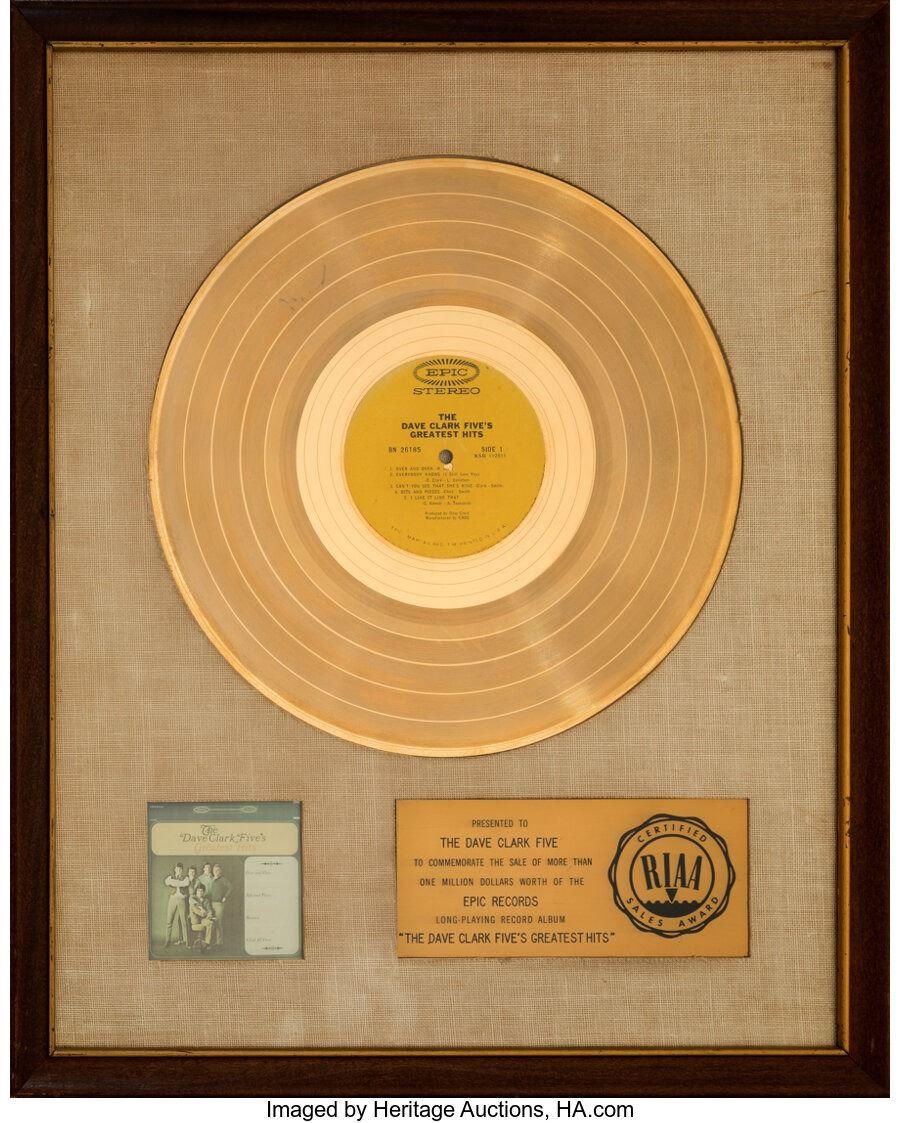 The Dave Clark Five PresentedGreatest HitsWhite Matte RIAA Gold Sales Award. A gold sales award for the Dave Clark Five's collection of hits, presented to the group. According to the plaque in the bottom right corner, "Presented To / The Dave Clark Five / To Commemorate the Sale of More Than / One Million Dollars Worth of the / Epic Records / Long-Playing Record Album / ‘The Dave Clark Five's Greatest Hits'." Measures 17 ½" x 21 ½". In Very Good Minus condition with significant toning on the matte and wear on the disc, as well as smudging/chipping on the frame. COA from Heritage Auctions.