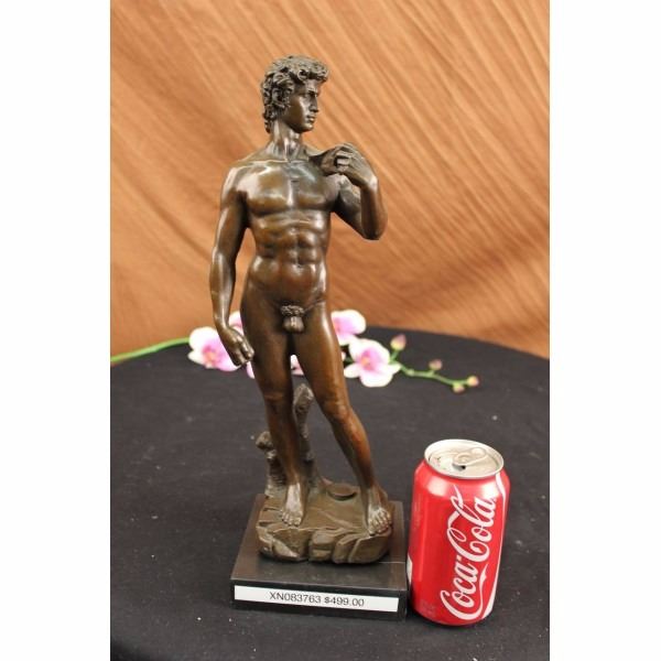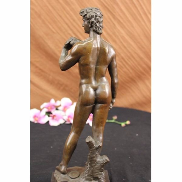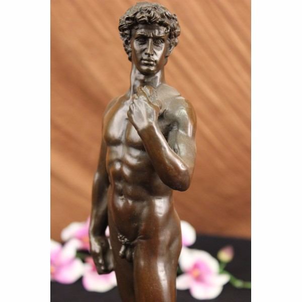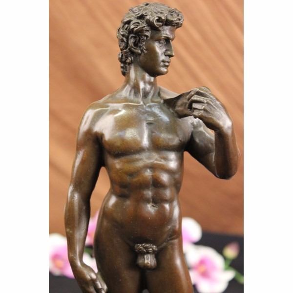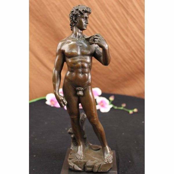 The Bronze Replica Of David Is A Masterpiece Of Renaissance Sculpture Created Between 1501 And 1504, By The Italian Artist Michelangelo. The Statue Represents The Biblical Hero David, A Favoured Subject In The Art Of Florence. ly Commissioned As One Of A Series Of Statues Of Prophets To Be Positioned Along The Roof Line Of The East End Of Florence Cathedral, The Statue Was Instead Placed In A Public Square, Outside The Palazzo Della Signoria, The Seat Of Civic Government In Florence, Where It Was Unveiled On 8 September 1504. Because Of The Nature Of The Hero That It Represented, It Soon Came To Symbolize The Defence Of Civil Liberties Embodied In The Florentine Republic, An Independent City-State Threatened On All Sides By More Powerful Rival States And By The Hegemony Of The Medici Family. The Eyes Of David, With A Warning Glare, Were Turned Towards Rome. This Relic Work Of Art Was Cast Using The Ancient Method Of Lost-Wax Casting And Stained With A Brown Patina Finish For Preservation. Bronze dimensions with marble base: Height 15 X Width 7 inches. Weight: 10 lbs.