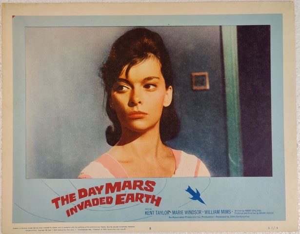 The Day Mars Invaded Earth (Associated Producers, 20th Century Fox; 1963) lobby card. Sci-Fi. Starring Kent Taylor, Marie Windsor, William Mims, Betty Bealll, Lowell Brown, Gregg Shank, Henrietta Moore, Troy Melton, George Riley. Directed by Maury Dexter. Very minor edge wear, very minor creases. Near Mint. (11"x14").
