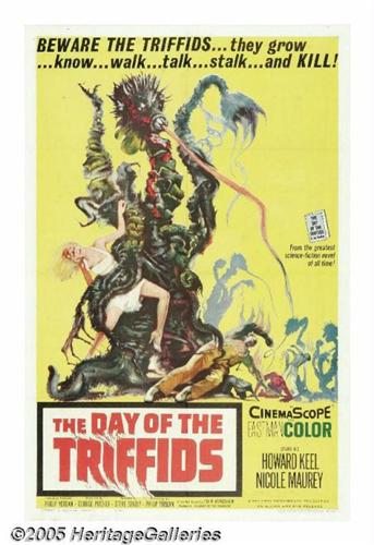 <B>The Day of the Triffids (Allied Artists, 1960).</B></I> One Sheet (27" X 41"). Based on the novel by John Wyndham, the film begins with a brilliant meteor shower so bright that it blinds most of the world's population, leaving them helpless against hordes of alien carnivorous plants known as "Triffidus Celestus." The wonderful artwork for this sci-fi classic was created by Joseph Smith. There are smudge marks and light soiling, pinholes across the top border, a couple of pinholes in the background graphics and one small border stain. Very Fine-.
