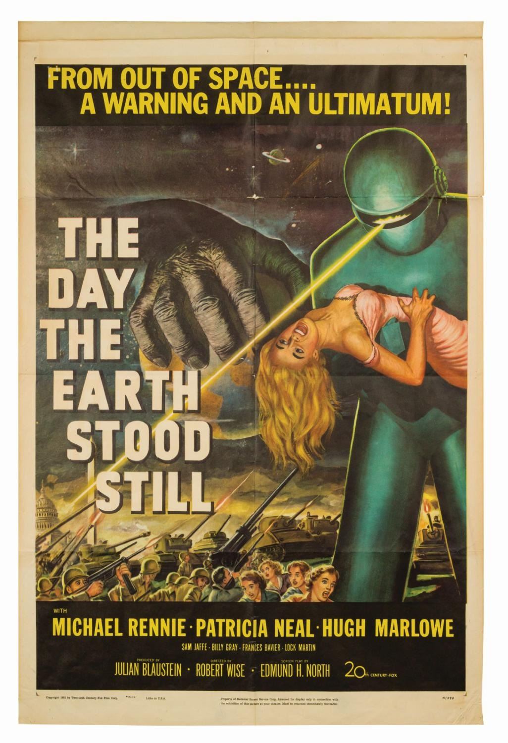 (TCF, 1951) An original U.S. 1-sheet poster for director Robert Wise's poignant sci-fi parable, The Day the Earth Stood Still. This genre-defining 1-sheet boasts both poetics and action, pairing a symbolic illustration of an alien hand gripping the planet with a dynamic composition depicting the death-ray-shooting robot, Gort, menacing a supine Patricia Neal while an Earthling army futilely burns through its munitions. Folded as issued, the poster measures 41"x27" and is in very good condition. There is 1" of the top blank border that is folded backwards, cello tape has been used on the reverse for reinforcement, there are small spots of separation and paper loss, light brown toning at the edges and in the top margin, and edge wear. The colors remain bright and vibrant. It has become exceedingly hard to find a completely unrestored example of this poster that presents as well as the piece offered here, as, by this point, many have undergone some level of retouching and repair. This is a rare opportunity to own an essential showpiece for any serious science fiction collection.