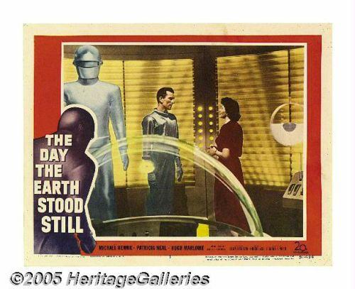 <B>The Day the Earth Stood Still (20th Century Fox, 1951)</B></I> Lobby Card (11" X 14"). Robert Wise's classic science fiction epic is still the standard by which all other sci-fi films are compared. This fantastic scene card features three of the films stars; Patricia Neal, Michael Rennie and the mighty robot Gort. There are light smudge marks, and minor foxing around the borders, otherwise fine. Very Fine-.