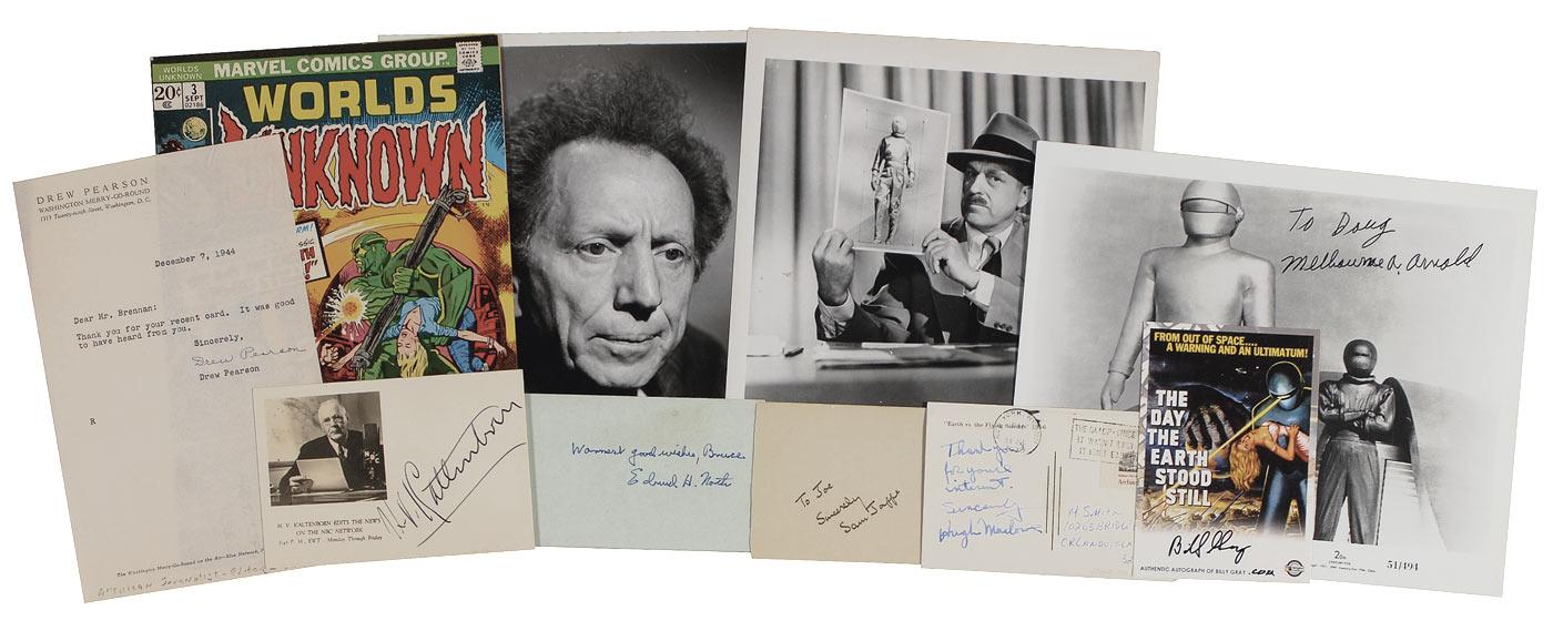 Seven items: five felt tip or fountain pen signatures on individual slips or cards. Signers are Edmund H. North (ins), Sam Jaffe (ins), H. V. Kaltenborn, Hugh Marlowe, Bill Gray; a 10 x 8 glossy photo signed and inscribed in black felt tip, “To Doug, Melbourne A. Arnold”; and a TLS (1944) from Drew Pearson. Accompanied by two unsigned photos and an unsigned World Unknown comic book (1973) adaptation of the film. In overall fine condition.