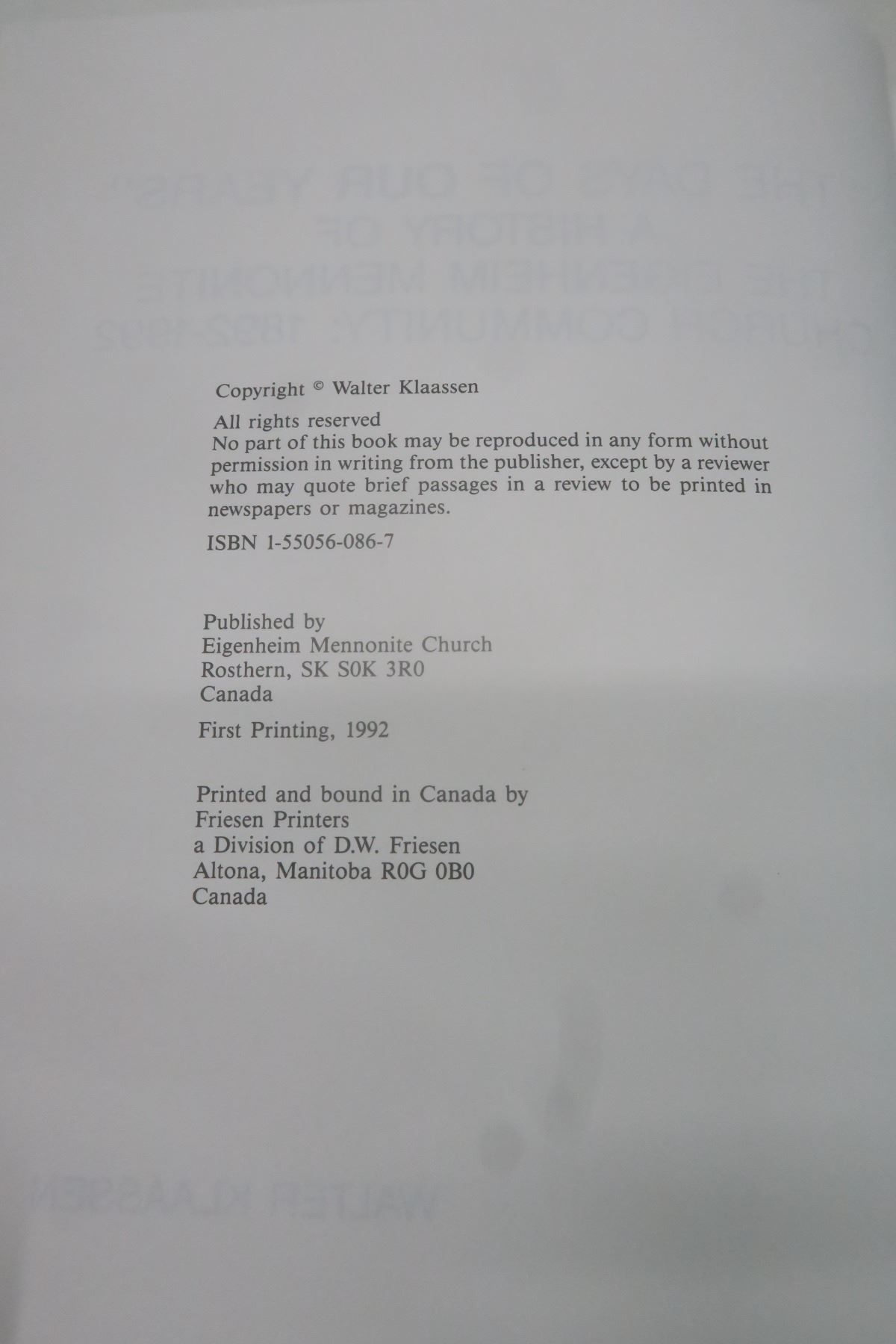 "The Days of our Years" History of Eigen Heim Mennonite Church (1992)