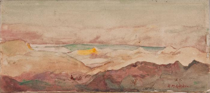 Hilda May Gordon (1874-1972). British archaeologist and painter. Studied under Frank Brangwyn and Sir Hubert von Herkomer at the Bushy School of Art and joined Brangwyn on a painting trip to Italy in 1900. A significant part of her paintings consists of tens of aquarelles painted in Palestine around the year 1900. Although inspired by the Orientalist academic trend, some individual shades can be traced in Hilda May Gordon's small paintings, in particular her tendency towards the light cloudy shade, and her remote view which is always one of a curious but cautious tourist.She set off travelling for a few months in 1922 and ended up going on a trip around the world, which lasted six years. During this time she visited India, Kashmir, Tibet, Burma, Thailand, Indonesia, China and Japan and produced a large body of watercolour paintings - the product of her keen ability to render people and the atmosphere of exotic places in colourful compositions.