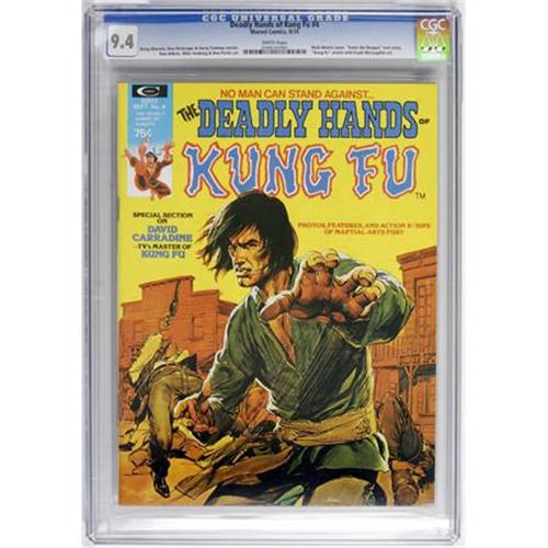 <B>The Deadly Hands of Kung Fu #4 (Marvel, 1974) CGC NM 9.4 White pages.</B></I> Neal Adams cover. "Enter the Dragon" text story. Special section on David Carradine. Dan Adkins, Mike Vosburg, and Don Perlin art. Overstreet 2007 NM- 9.2 value = $32. CGC census 10/07: 6 in 9.4, 3 higher.<BR><BR><b>Shipping:</b> Comics - Slabbed (certified) (<a target="_blank" href="http://www.heritageauctions.com/common/shipping.php">view shipping information</a>)