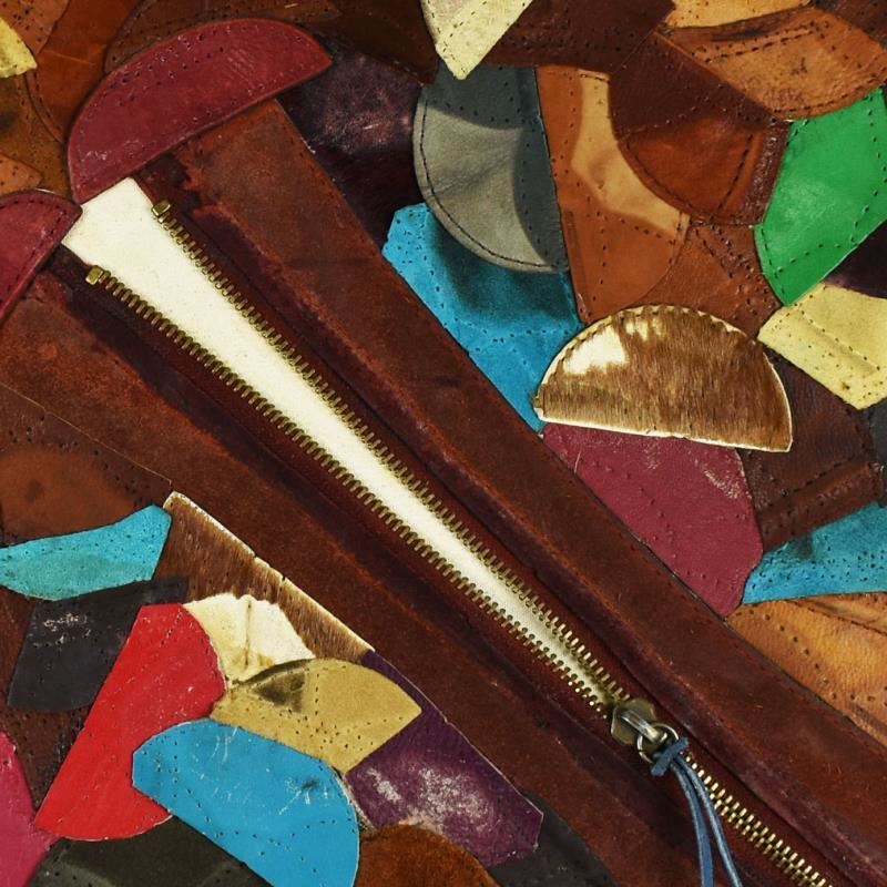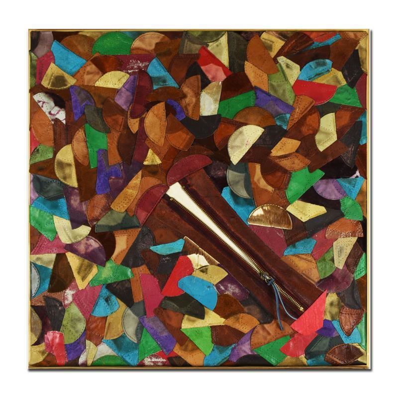 "The Deconstruction & Final Repurposing of a Leather Bag" is an original leather collage collage on canvas board by George Marlowe. The piece is hand signed and ready to hang; accompanied by a certificate of authenticity. Measures approximately 25x25" (frame), 24x24" (image).