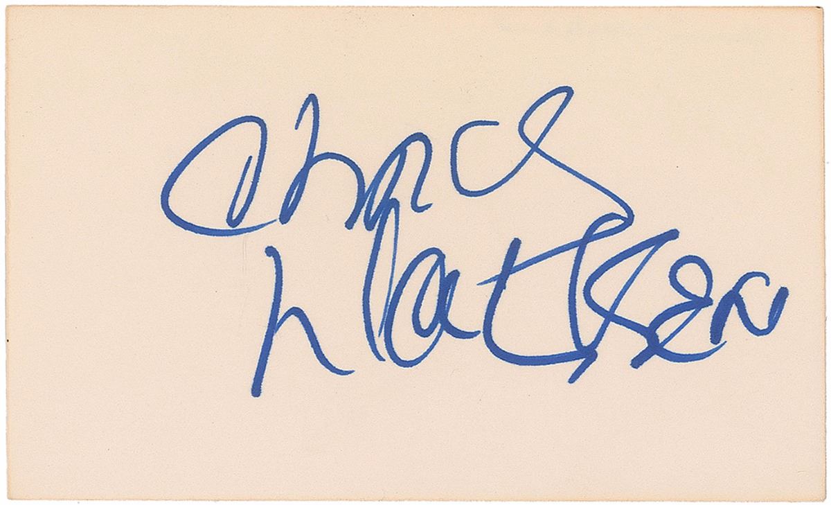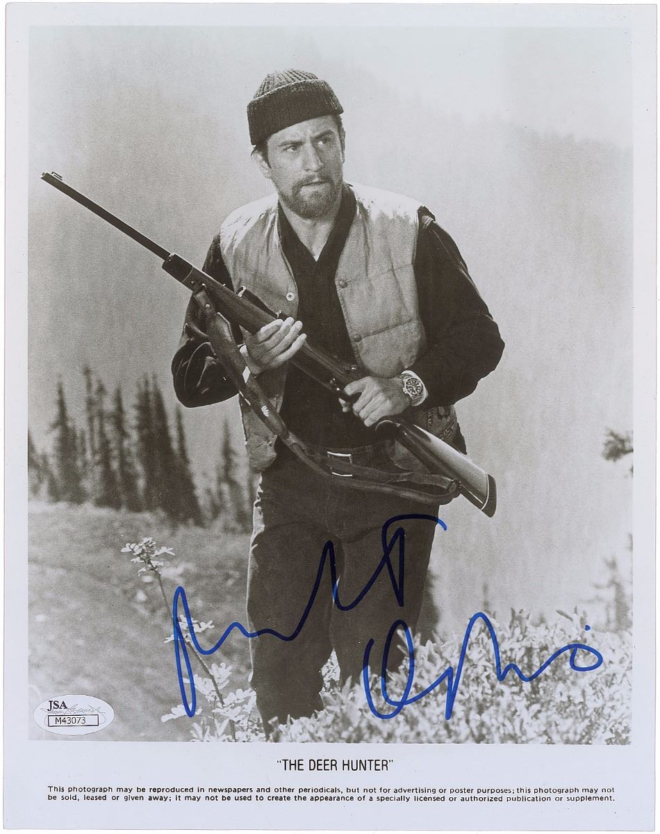 Two items: a glossy 8 x 10.25 publicity photo of De Niro as Michael from the 1978 film The Deer Hunter, signed in blue felt tip, “Robert De Niro”; and a blue felt tip signature, “Chris Walken,” on an off-white 5 x 3 card. In overall fine condition, with a JSA label affixed to the lower left of the photo. Accompanied by a certificate of authenticity from JSA.