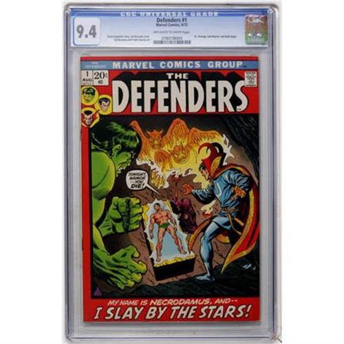 <B>The Defenders #1 (Marvel, 1972) CGC NM 9.4 Off-white to white pages.</B></I> The Hulk, Doctor Strange, and Sub-Mariner begin. Sal Buscema cover and art. Overstreet 2007 NM- 9.2 value = $175. CGC census 9/07: 76 in 9.4, 42 higher. <I> From the Fantastic Frank Collection.</B></I><BR><BR><b>Shipping:</b> Comics - Slabbed (certified) (<a target="_blank" href="http://www.heritageauctions.com/common/shipping.php">view shipping information</a>)