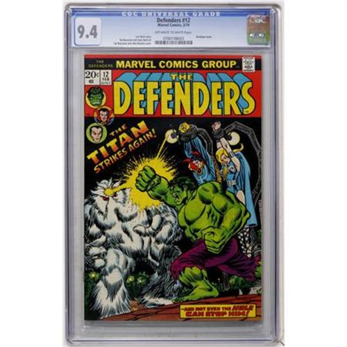 <B>The Defenders #12 (Marvel, 1974) CGC NM 9.4 Off-white to white pages.</B></I> Sal Buscema and John Romita bondage cover. Overstreet 2007 NM- 9.2 value = $16. CGC census 9/07: 10 in 9.4, 10 higher. <I> From the Fantastic Frank Collection.</B></I><BR><BR><b>Shipping:</b> Comics - Slabbed (certified) (<a target="_blank" href="http://www.heritageauctions.com/common/shipping.php">view shipping information</a>)