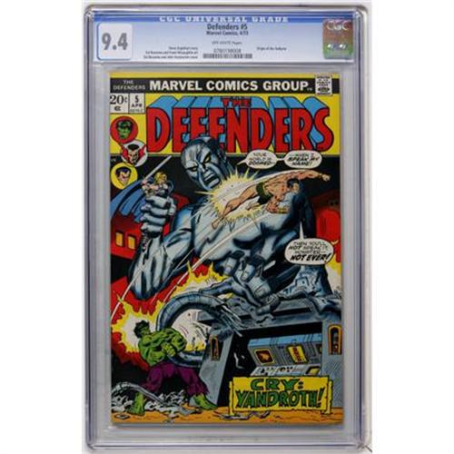 <B>The Defenders #5 (Marvel, 1973) CGC NM 9.4 Off-white pages.</B></I> Origin of the Valkyrie. Sal Buscema cover. Buscema and Frank McLaughlin art. Overstreet 2007 NM- 9.2 value = $50. CGC census 9/07: 11 in 9.4, 8 higher. <I> From the Fantastic Frank Collection.</B></I><BR><BR><b>Shipping:</b> Comics - Slabbed (certified) (<a target="_blank" href="http://www.heritageauctions.com/common/shipping.php">view shipping information</a>)