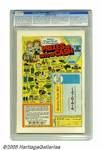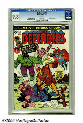 <B>The Defenders #9 Winnipeg pedigree (Marvel, 1973) CGC NM/MT 9.8 White pages.</B></I> Large-scale comic crossovers may be commonplace today, but in 1973, it was unheard-of to have a crossover spanning eight issues of two different titles! Yet that's exactly what writer Steve Englehart and editor Roy Thomas pulled off to produce the "Avengers/Defenders War." This issue has the third installment of the storyline, with art by Sal Buscema. A side note for you No-Prize types: Buscema's cover pictures the Hulk and the Sub-Mariner, who don't appear in the issue! No copy of this Bronze Age winner has been graded higher by CGC to date. Overstreet 2005 NM- 9.2 value = $30. CGC census 6/05: 3 in 9.8, none higher.