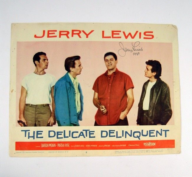 "The Delicate Delinquent" (1957) holds a special place in Hollywood history, since it was the film that broke up one of the most successful comedy teams in America, Dean Martin and Jerry Lewis. There were problems between Dean Martin and Jerry Lewis before the movie, but a major disagreement on the film ended their relationship. The part that was originally written for Martin went to Darren McGavin, and Lewis began his solo career. It was also on this film that director Don McGuire, as a joke, let Lewis direct a scene. However the bug hit Lewis hard, and the rest, as they say, is history! This is an original lobby card from the movie, and is signed by Jerry Lewis himself. In good condition. Lobby card is 11"x14".