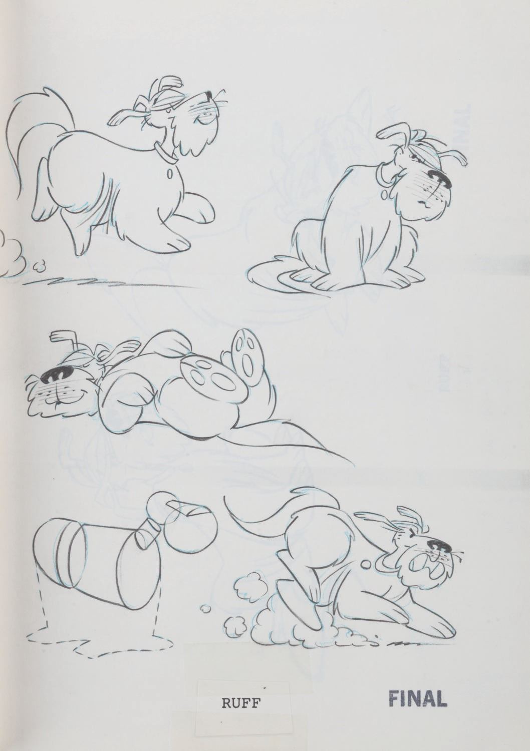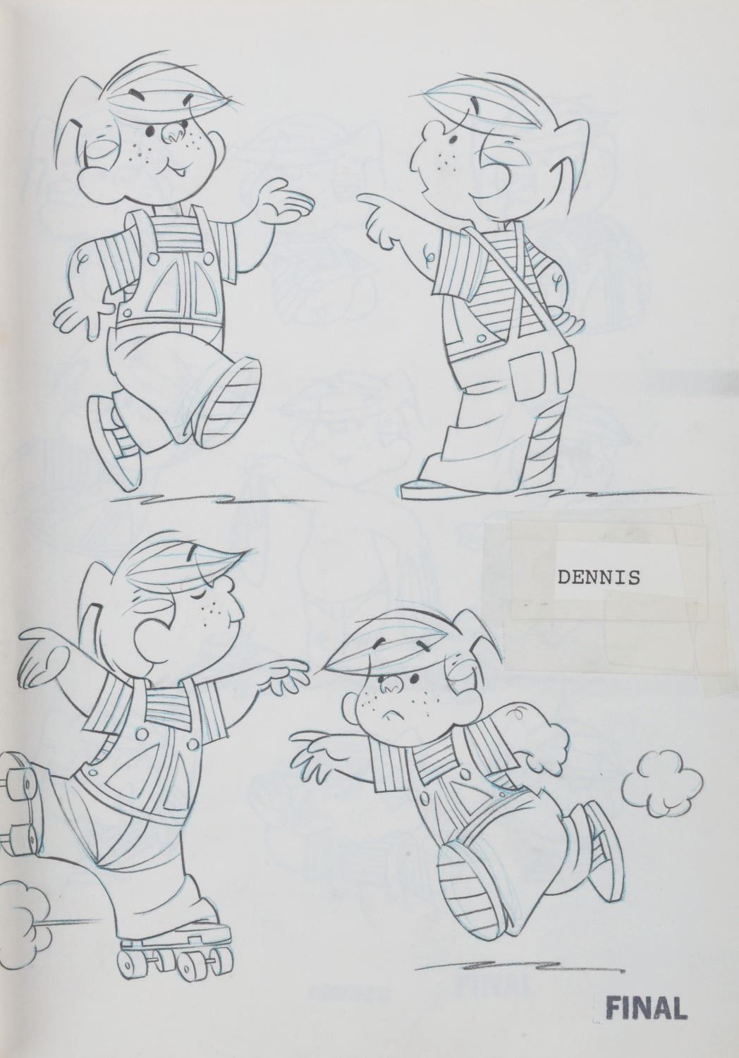 (DIC, 1986) The original character model pack for the “Dennis the Menace” animated series, based on Hank Ketcham’s long-running newspaper comic strip of the same name. Included are 27 pages of character poses, expressions, and turnarounds. 22 of these pages are original drawings in graphite, while five are cut and taped photocopies. The characters included are Dennis, Mr. and Mrs. Mitchell, George and Martha Willson, Margaret, Joey, Gina, and Ruff the dog. Measuring 8.5” x 11” bound in a 9” x 11.5” folder, the model pack is in very good condition with light edge wear from handling and a spot of paper loss to the folder cover.