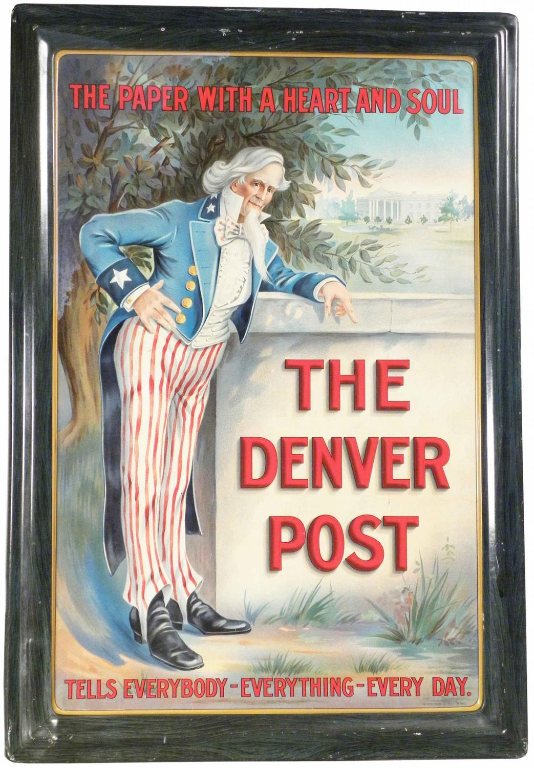 The Denver Post Self Framed Tin Sign. Featuring Uncle Sam. Entitled, "The Paper with a Heart and Soul". The Meek Co. Coshocton, OH. Lithographers. A few minor rubs around perimeter otherwise excellent condition. 13 1/4 X 19 1/2 inches. Starting bid $1000