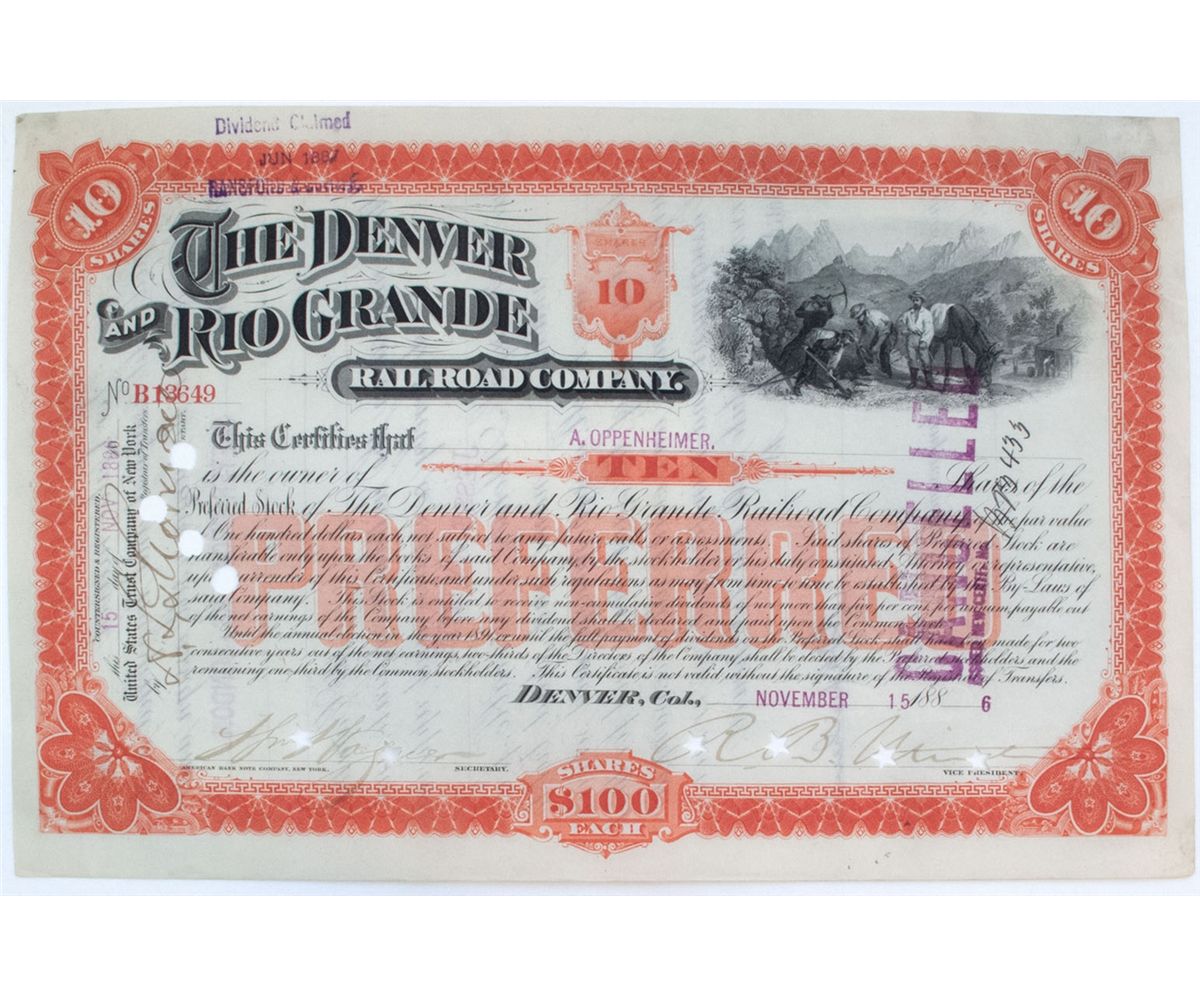 Certificate issued in 1886 to A. Oppenheimer for10 shares of preferred stock at $100 each. Signed by the company officers. The famous Colorado railroad began as a narrow guage out of Denver in 1870 and served Leadville during it’s boom. Oval vignette of miners in the mountains. Stamp and hole cancels. EF.