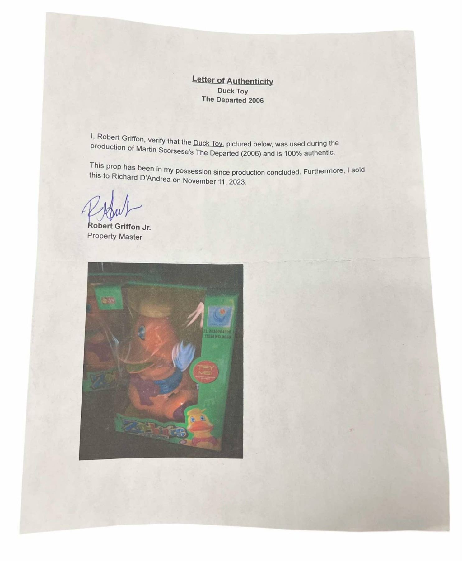 Original prop duck used in the production of the Martin Scorsese directed crime thriller film 'The Departed' (2006), loosely based on the real-life Boston Winter Hill Gang; the character Colin Sullivan is based on the corrupt FBI agent John Connolly, while the character Frank Costello is based on Irish-American gangster Whitey Bulger.