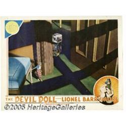 <B>The Devil-Doll (MGM, 1936)</B></I> Lobby Card (11" X 14"). Falsely convicted Paul Lavond (Lionel Barrymore) along with his crazed assistant Malita (Rafaela Ottiano) attempt to exact vengeance on those who have wronged him by using people who have been miniaturized. The extraordinary miniature work in "The Devil Doll" was accomplished by using oversized sets. The scene card offered in this lot is the only one from the set that features one of the diminutive demons. There are corner pinholes, light scuffs, and small border stains. The colors remain radiant and the card displays very well. Very Fine.