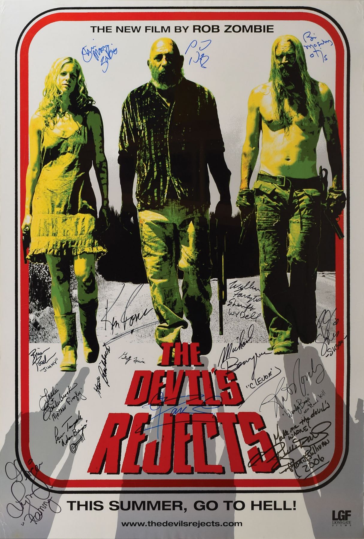 Dual-sided color 27 x 40 one-sheet movie poster for the 2005 film The Devil's Rejects, signed in black or blue felt tip by sixteen members of the cast and crew, including: Rob Zombie, Sheri Moon Zombie, Sid Haig, Bill Moseley, Michael Berryman, Ken Foree, Leslie Easterbrook, William Forsythe, Priscilla Barnes, Geoffrey Lewis, Kate Norby, Lew Temple, Steve Railsback, Brian Posehn, Ginger Lynn Allen, and P. J. Soles, with several actors adding their character names. Rolled and in fine condition.