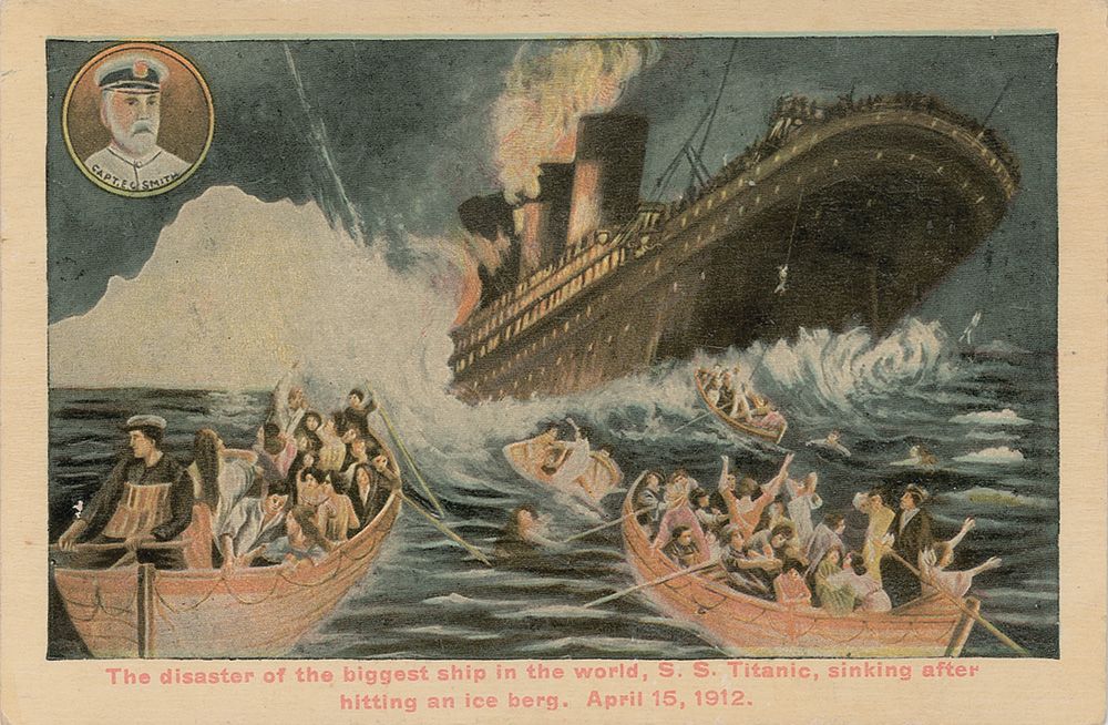 Unused color postcard by the White Star Publishing Company of New York, featuring an artist’s rendition of lifeboats rescuing passengers as the Titanic sinks, captioned at the bottom: “The disaster of the biggest ship in the world, S. S. Titanic, sinking after hitting an iceberg. April 15, 1912.” In fine condition, with light toning and damp staining to the reverse.