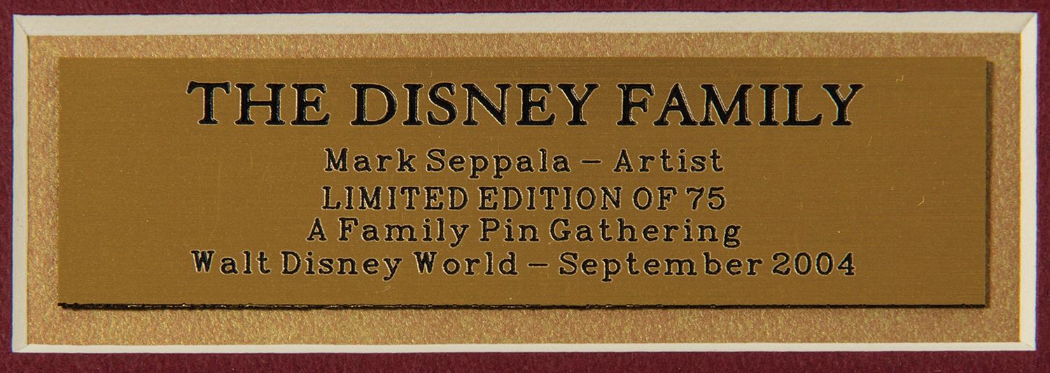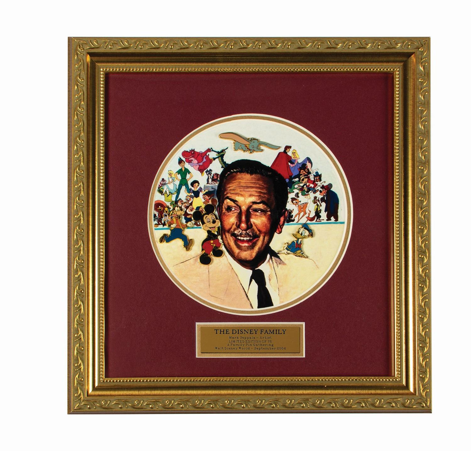 (Walt Disney World, 2004) A limited edition framed pin set by artist Mark Seppala. Created in an edition of 75, the composition features four enamel character pins (Goofy, Mickey Mouse, Dumbo, and Donald Duck) framed over a background print depicting a portrait of Walt Disney with many of his most iconic cartoon characters. The piece is accompanied by a Walt Disney World Certificate of Verification. The pins range in size from 1.25"x1" to 2.25"x0.5" and the gold painted molded wood frame measures 13.75"x14". The set is in fine condition, being virtually as new.