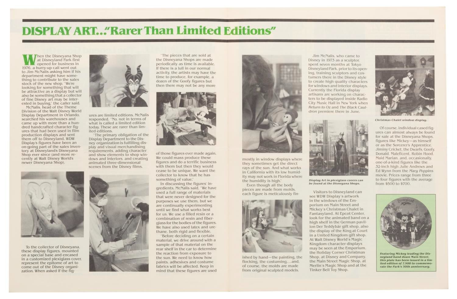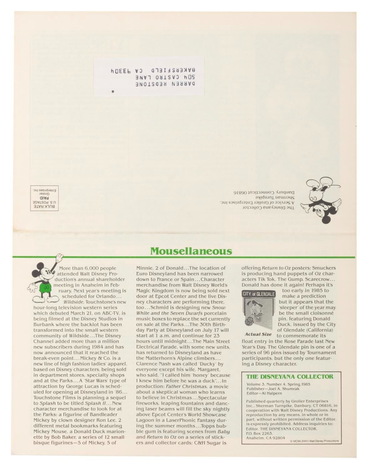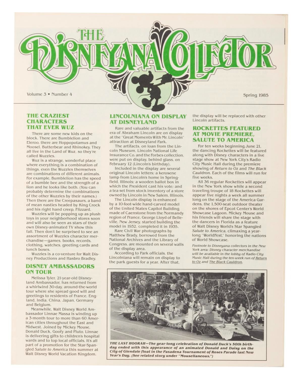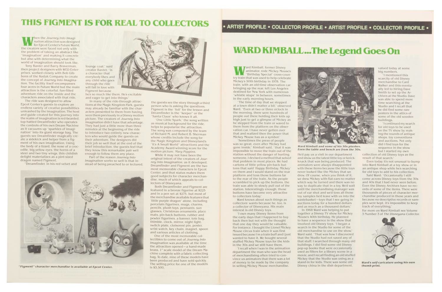 (Grolier, 1985) An issue of The Disneyana Collector newsletter from the spring of 1985, with articles on Ward Kimball and Figment. Measuring 8.5" x 11" the eight-page newsletter is in very good condition with light wear from mailing.