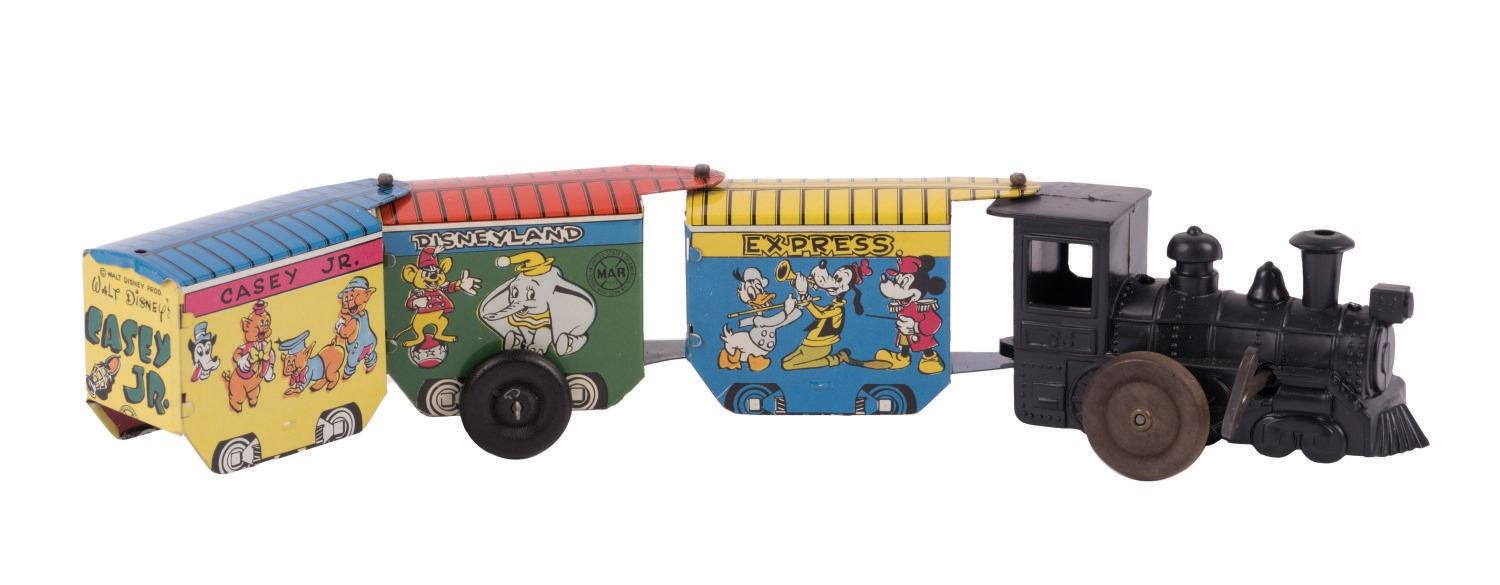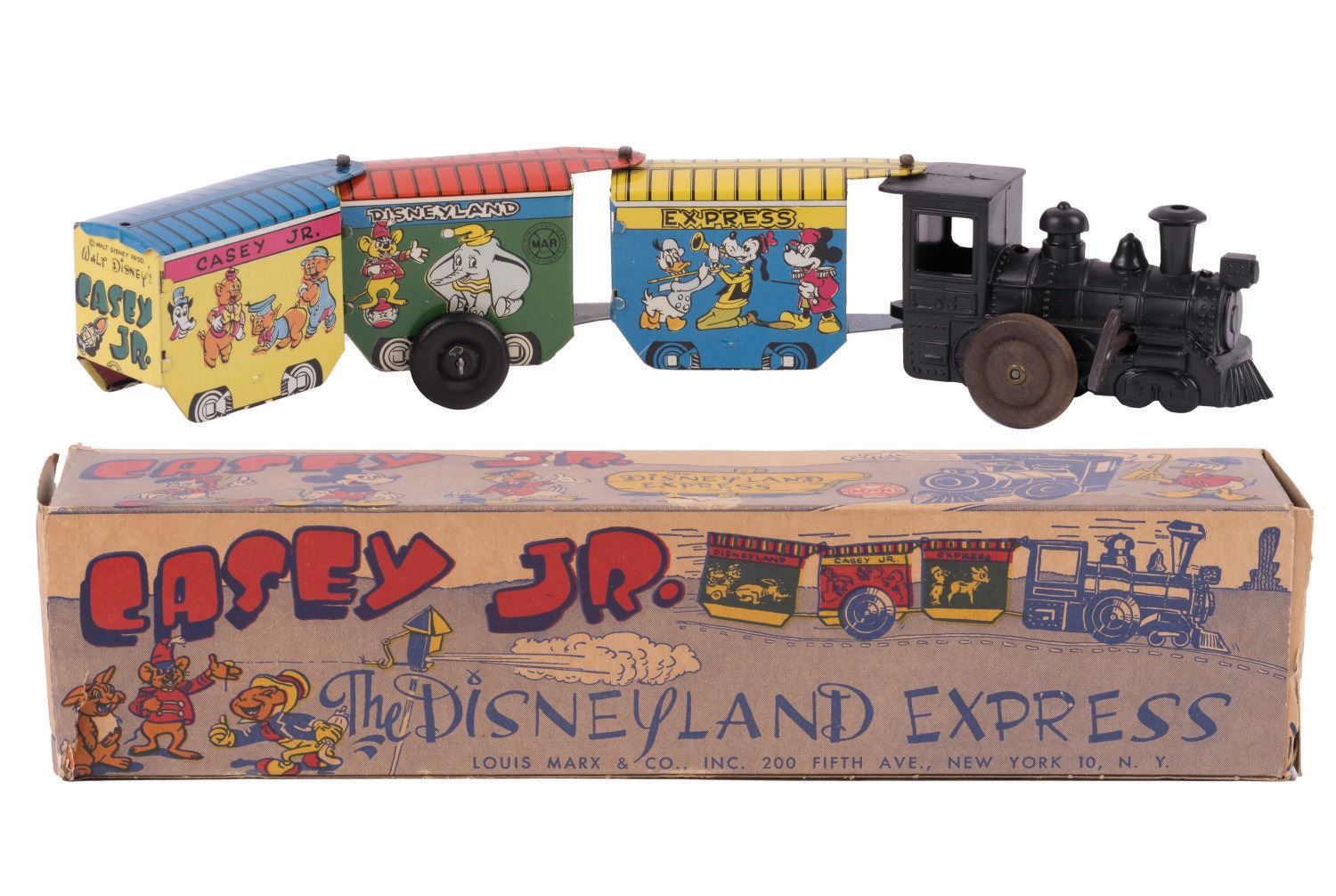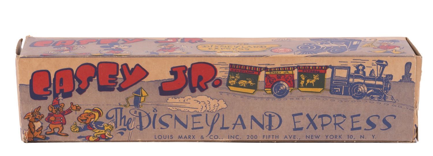 (Disneyland, 1950s) A tin-litho wind-up train titled the "The Disneyland Express Casey Jr." Created by Marx Toys, the train depicts Mickey, Minnie, Donald and his nephews, Pinocchio, Dumbo, and many other Disney characters with mechanized and molded plastic locomotive. The mechanisms do not appear to function. Measuring 12.5" long, the train is in very good and operable condition with minor scuffing and wear from use, and notably comes packaged within its colorful 12.75"x3"x2.75" good condition box.